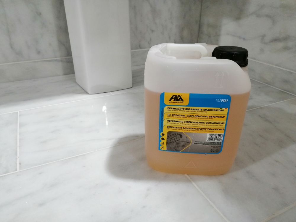 세라믹 타일을 청소할 때 가정용 세제를 사용했다면, 걸레질 후 타일 표면이 약간 희미해 보일 수 있습니다. 이는 비눗물이나 세제의 잔여물 때문일 수 있습니다. 이런 얇은 막은 비연마성 다목적 세정제와 깨끗한 걸레를 사용해 쉽게 제거할 수 있습니다. 또는 확실히 모든 잔여물을 제거하고 싶다면 Fila PS87 얼룩 제거제를 사용할 수 있습니다.