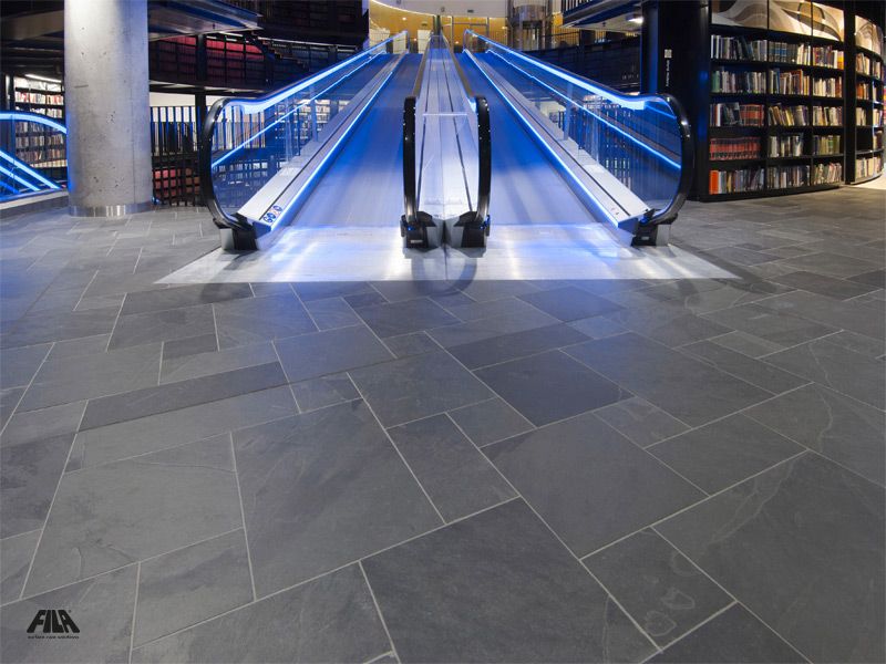다수의 수상 경력에 빛나는 버밍엄 도서관은 유럽에서 가장 큰 공공 건물로, FILA의 보호 및 관리 시스템으로 관리되었습니다. CLEANER PRO(pH 중성 세제) 및 W68(친환경 얼룩 방지제) 덕분에 도서관 1층과 인근 극장 전체에 설치된 1,800m² 이상의 슬레이트를 청소하고 보호할 수 있었습니다. 1억 8,900만 파운드(2,300만 유로 이상)가 투입된 이 프로젝트는 2013년 9월 취임 이후 이미 150만 명의 방문객을 유치했습니다. 브라질 슬레이트 석판은 미들랜드의 WB Simpson & Sons에 의해 세워졌습니다. 설치 후 CLEANER PRO 농축 중성 세제를 청소에 사용했으며, 이는 슬레이트와 같은 섬세한 자연석에 특화되었습니다. 그런 다음 표면은 다공성 표면에 이상적인 수성의 친환경 얼룩 방지제인 W68로 처리되었으며, 이는 표면 필름을 형성하지 않고 자연스러운 외관을 변경하지 않고 재료를 보호합니다.