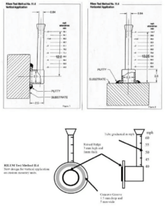 카르스텐 튜브 시험에서는 L자형 눈금이 있는 유리 기구를 시험 중인 표면에 퍼티로 고정하고, 시간에 따른 물 수준의 감소를 관찰합니다. 초기에 물 기둥은 140 km/h 바람에 의해 몰려오는 집중호우를 견딜 수 있는 압력을 표면에 가합니다.