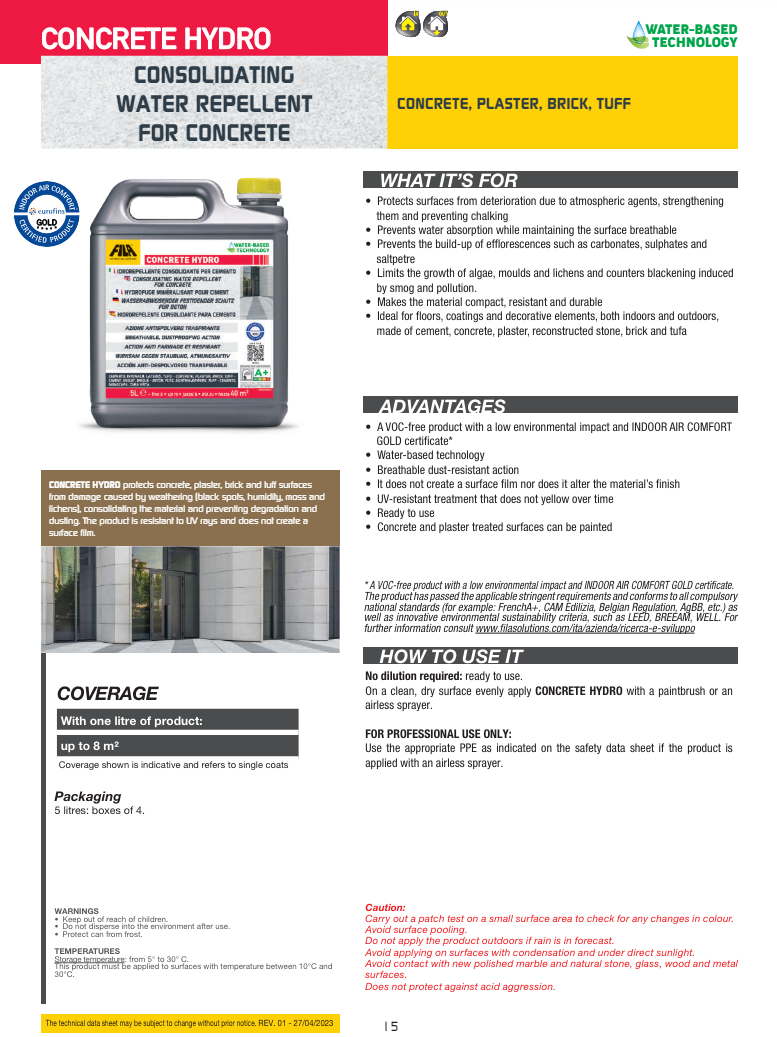 위에서 언급한 문제들이 발생하지 않도록 하기 위해, FILA의 CONCRETE HYDRO로 콘크리트와 벽돌 표면을 처리하는 것을 적극 추천합니다. 이 실링 처리를 통해 실내외를 막론하고 여러분의 표면이 수년간 보존될 수 있음을 확신할 수 있습니다.