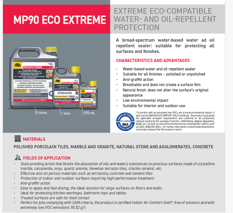 MP90 ECO XTREME은 FILA의 친환경 실러로, 오염물과 물기, 기름 얼룩이 스며드는 것을 방지합니다. 물 기반의 이 제품은 대리석, 화강암, 크랙 글레이즈 타일, 폴리싱된 도자기 타일 등 다양한 표면에 적합하며, 실내외에서 모두 사용할 수 있습니다.