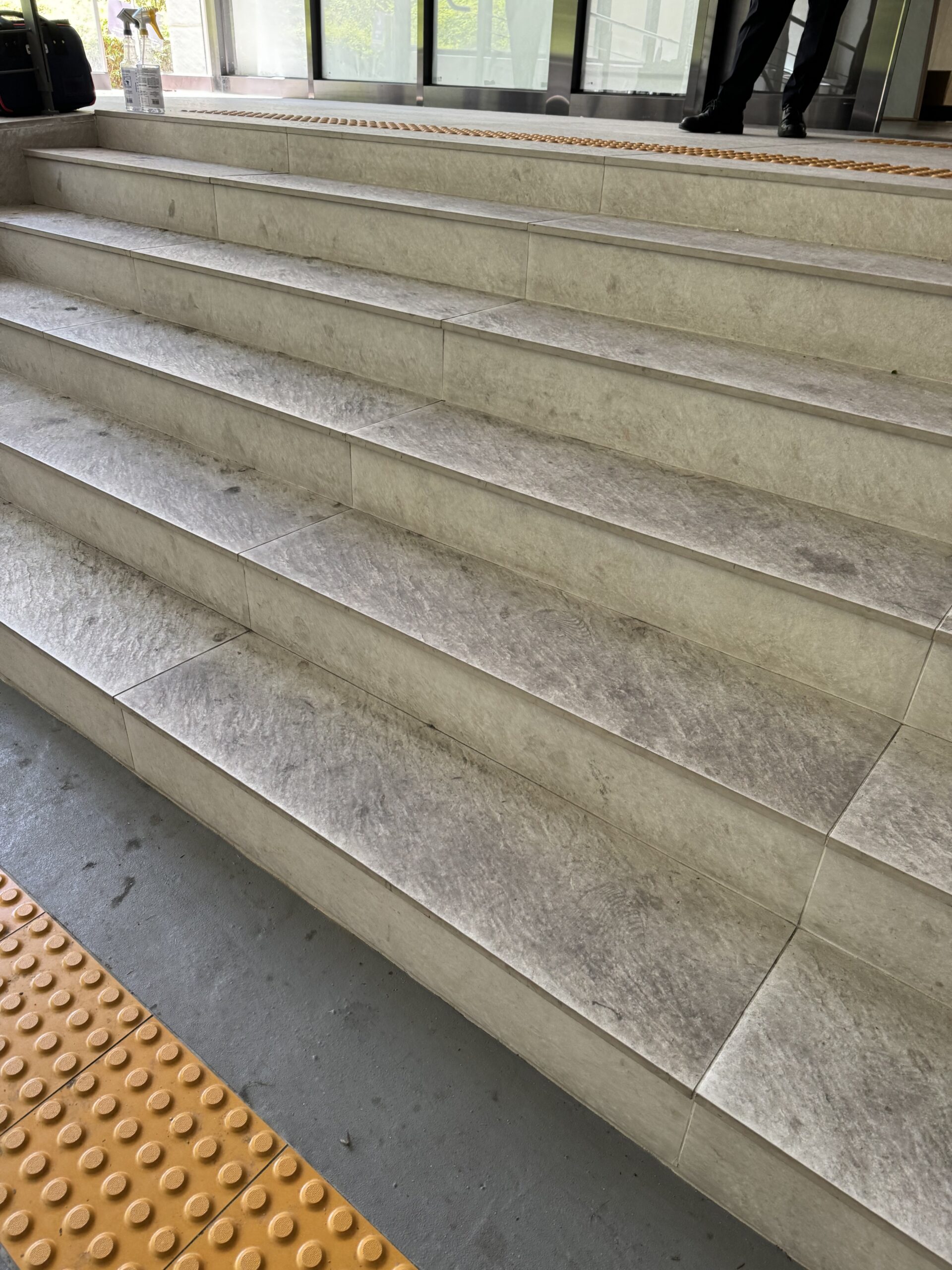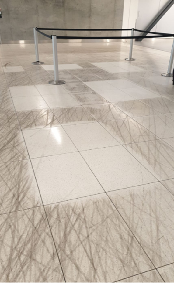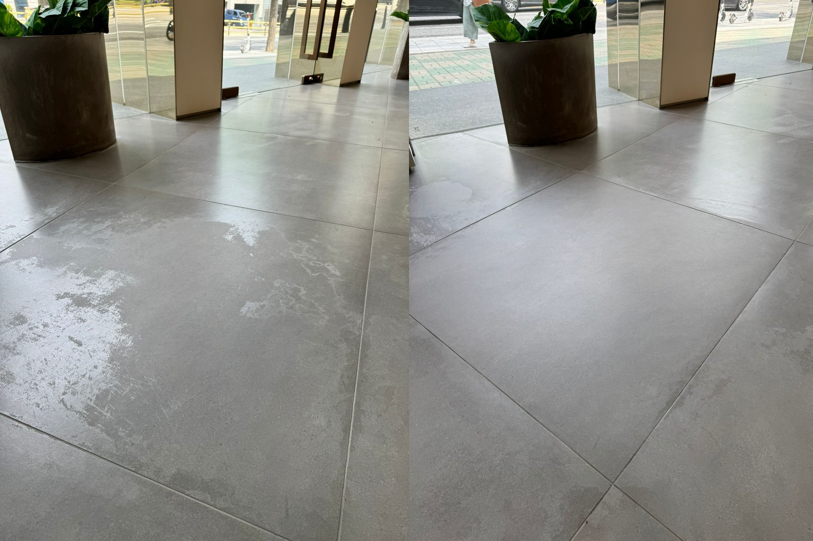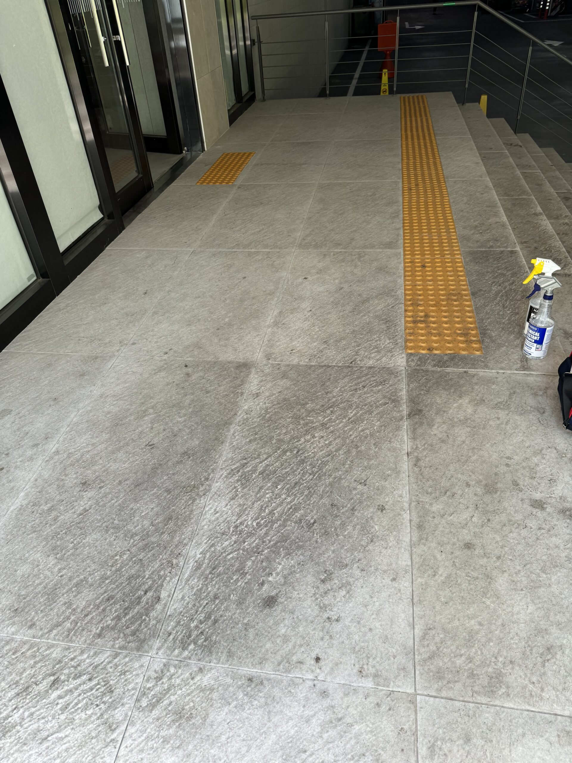 보통 아파트 주차장의 연결부위나 공용 입구에는 미끄러짐으로 방지를 하기 위해 R10 (논슬립: 미끄럼방지) 이상의 제품을 주로 사용을 합니다. 이런경우 주차장에서 오는 타이어 분진과 오일때 그리고 주차장 바닥을 청소할때 쓰여지는 세제의 잔여물이 뭍어 바닥의 자재에 차츰 쌓이게 되고 시간이 지나면 닦이지 않는 수준까지 올라갑니다.