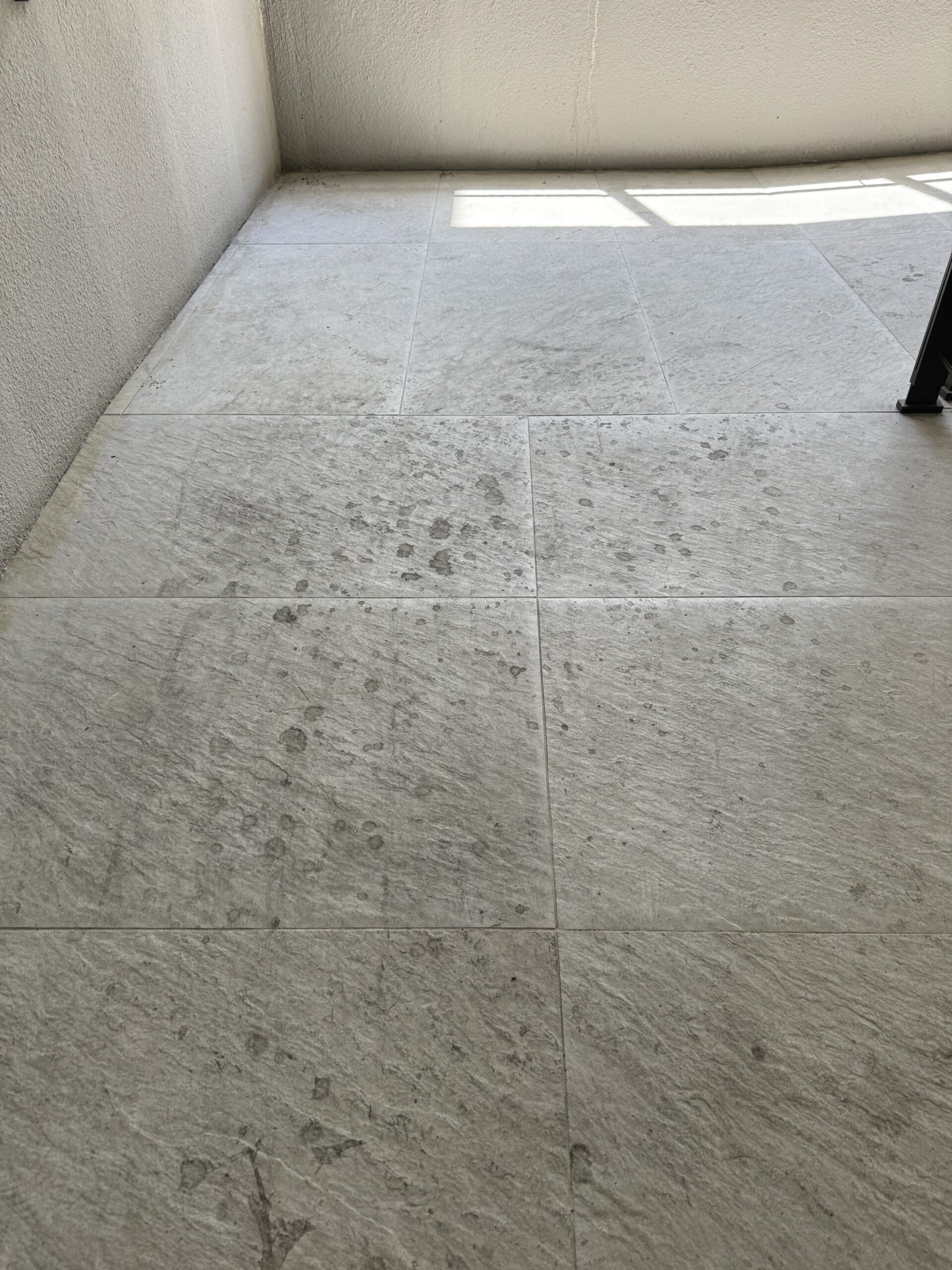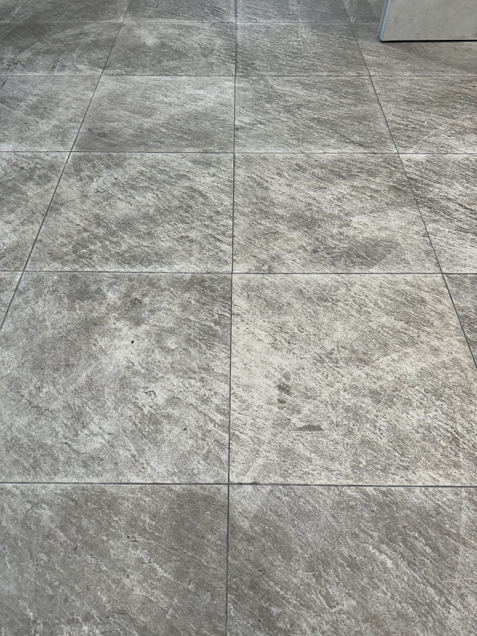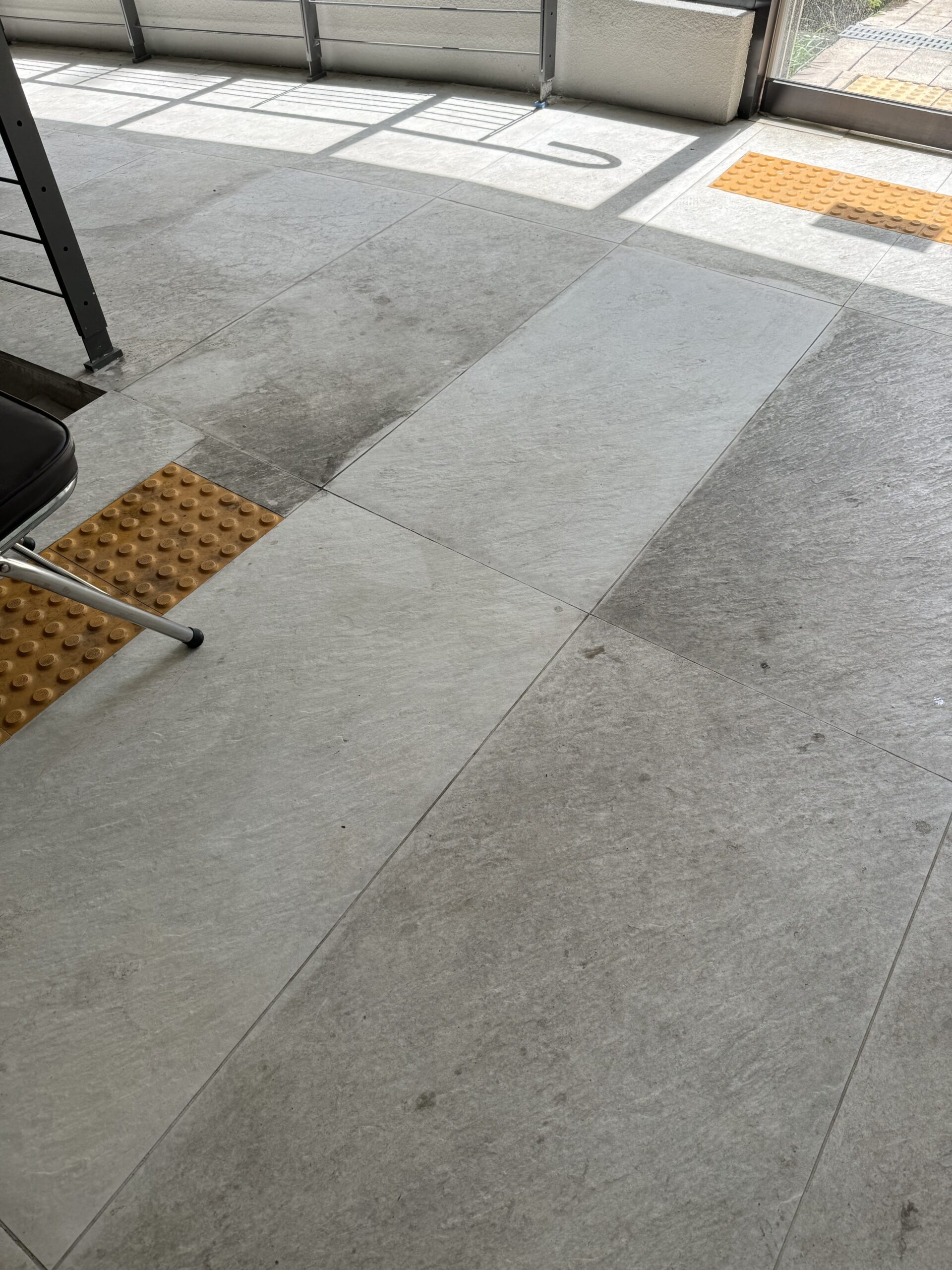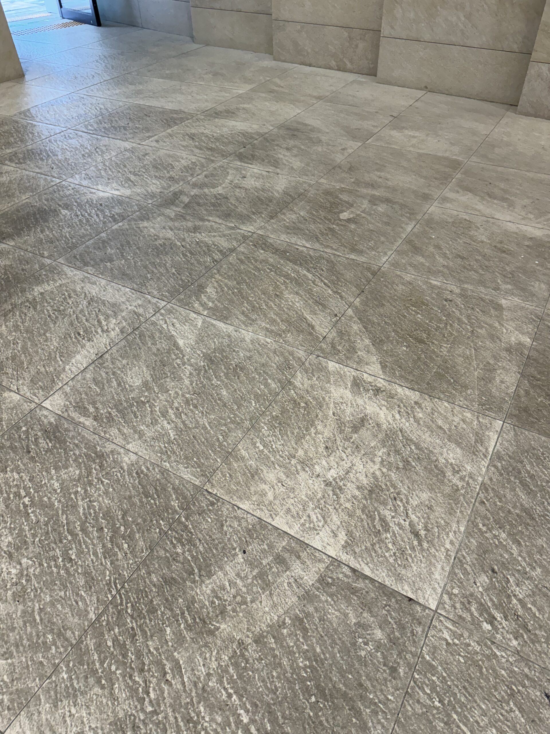보통 아파트 주차장의 연결부위나 공용 입구에는 미끄러짐으로 방지를 하기 위해 R10 (논슬립: 미끄럼방지) 이상의 제품을 주로 사용을 합니다. 이런경우 주차장에서 오는 타이어 분진과 오일때 그리고 주차장 바닥을 청소할때 쓰여지는 세제의 잔여물이 뭍어 바닥의 자재에 차츰 쌓이게 되고 시간이 지나면 닦이지 않는 수준까지 올라갑니다.