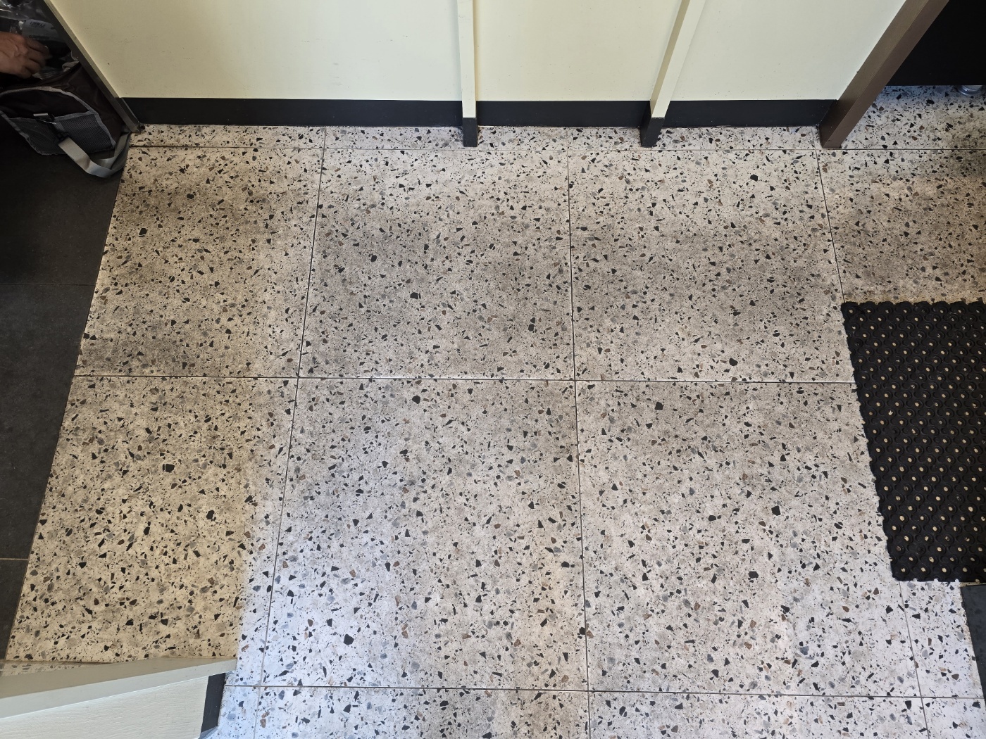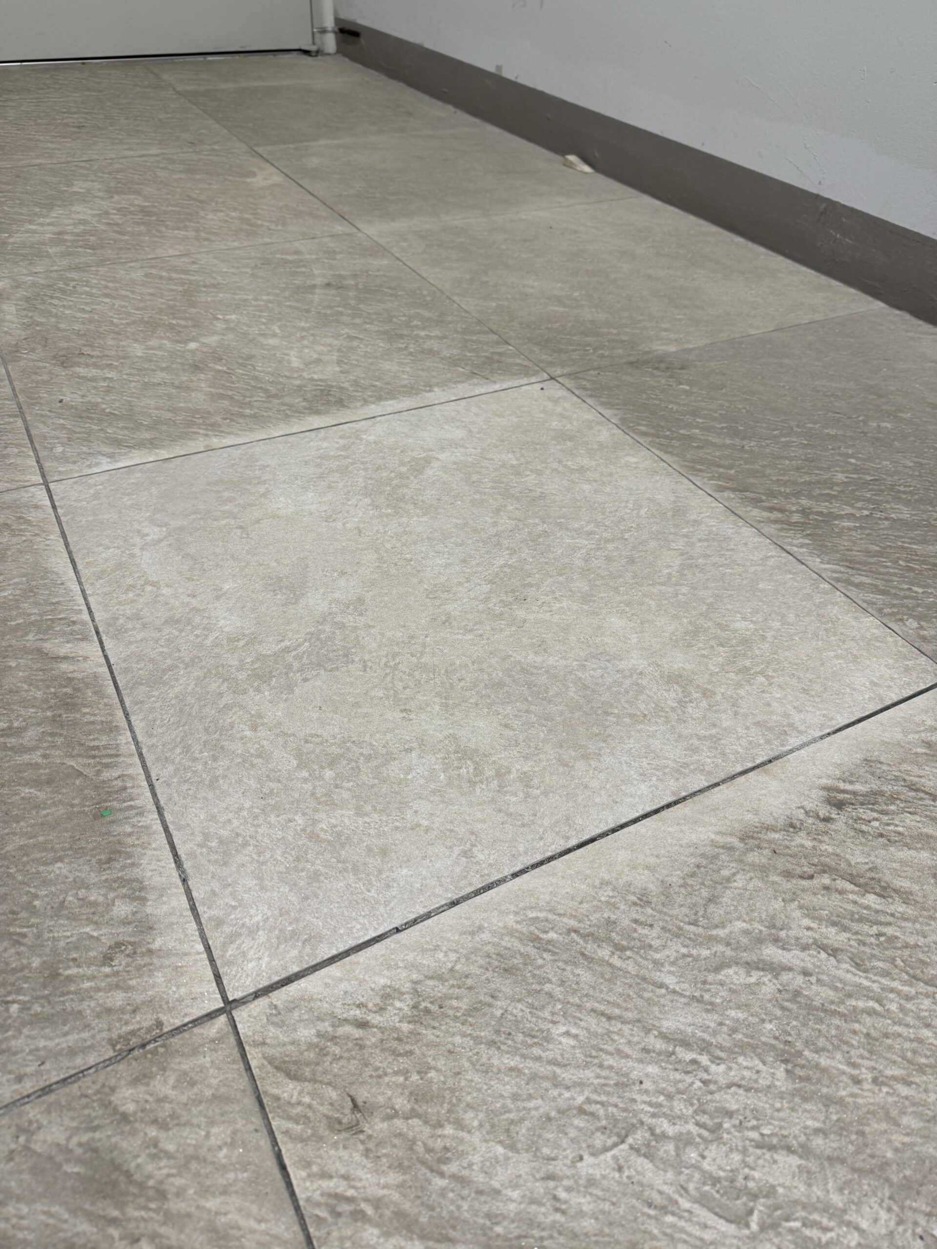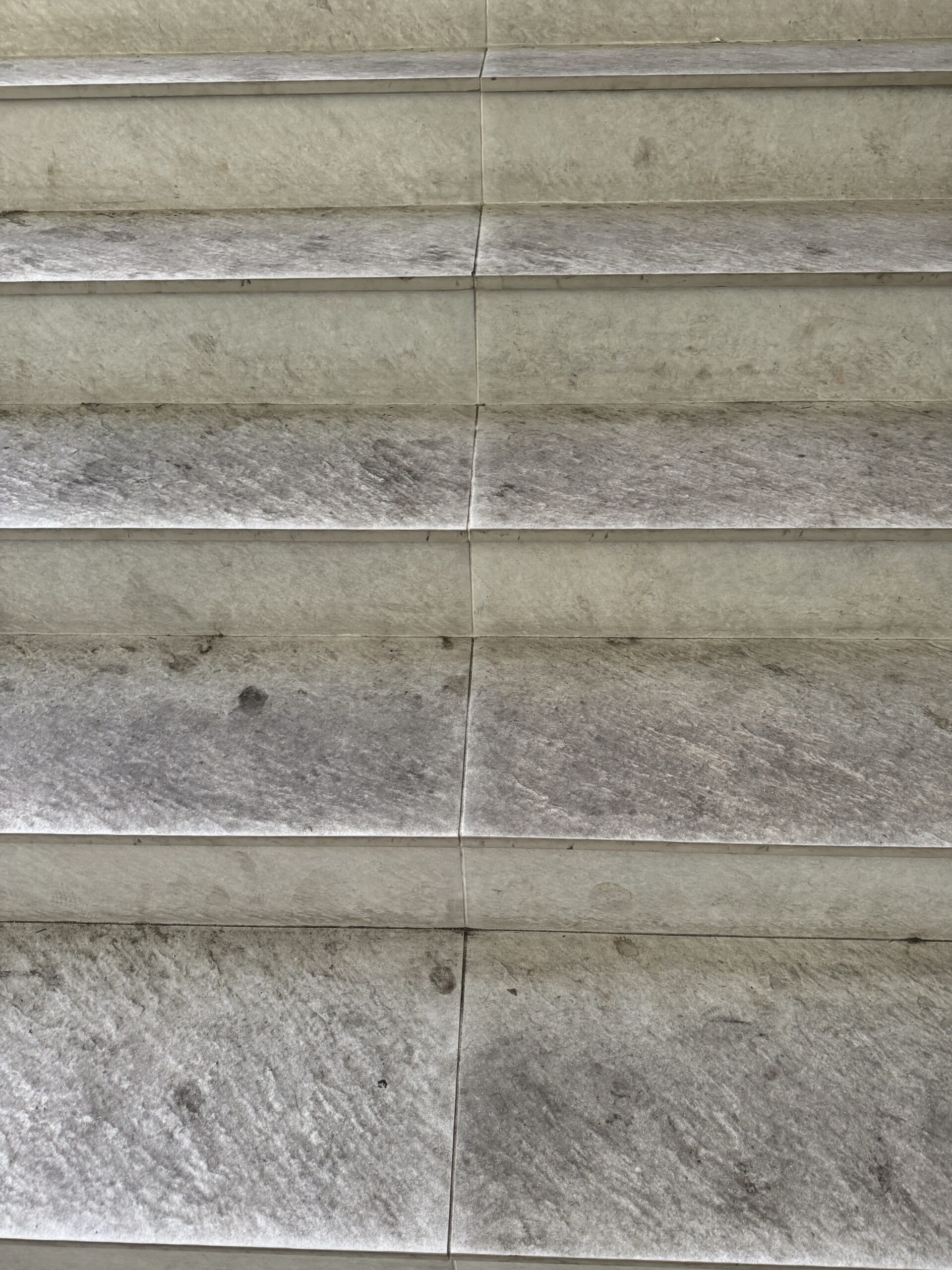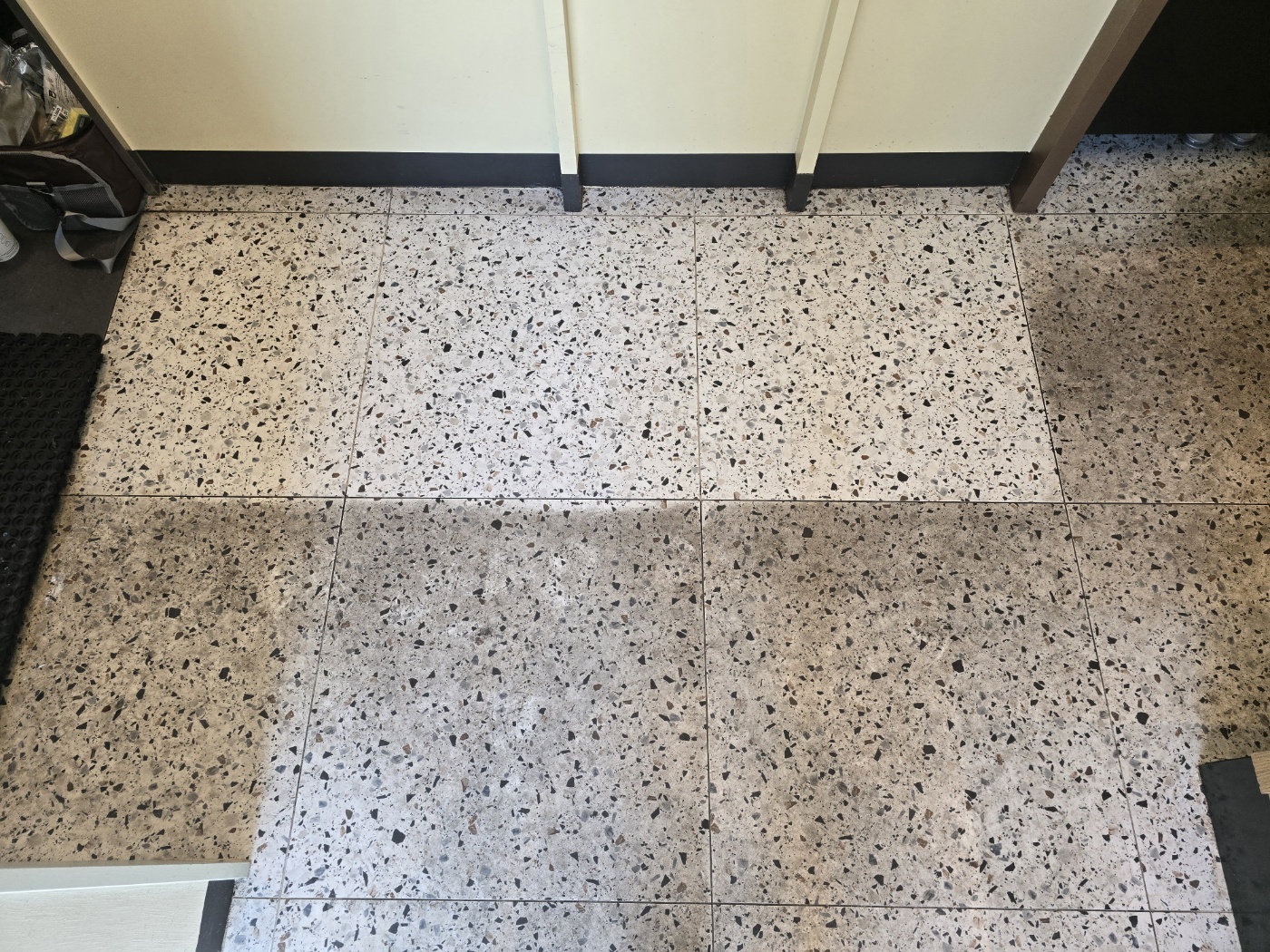 보통 아파트 주차장의 연결부위나 공용 입구에는 미끄러짐으로 방지를 하기 위해 R10 (논슬립: 미끄럼방지) 이상의 제품을 주로 사용을 합니다. 이런경우 주차장에서 오는 타이어 분진과 오일때 그리고 주차장 바닥을 청소할때 쓰여지는 세제의 잔여물이 뭍어 바닥의 자재에 차츰 쌓이게 되고 시간이 지나면 닦이지 않는 수준까지 올라갑니다.