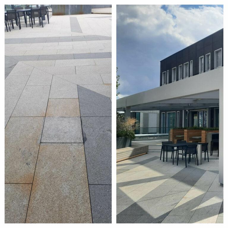 DETERDEK PRO를 시멘트 및 그라우트 제거제로 사용할 수 있지만 여러 다른 용도로도 사용할 수 있습니다. 더 넓은 지역의 경우 이 세제는 이중 석회질 제거 및 청소 작용 덕분에 화강암 및 도자기 타일의 녹 자국을 제거할 수 있습니다. 아래는 화강암에서 녹을 제거하기 전과 후입니다.