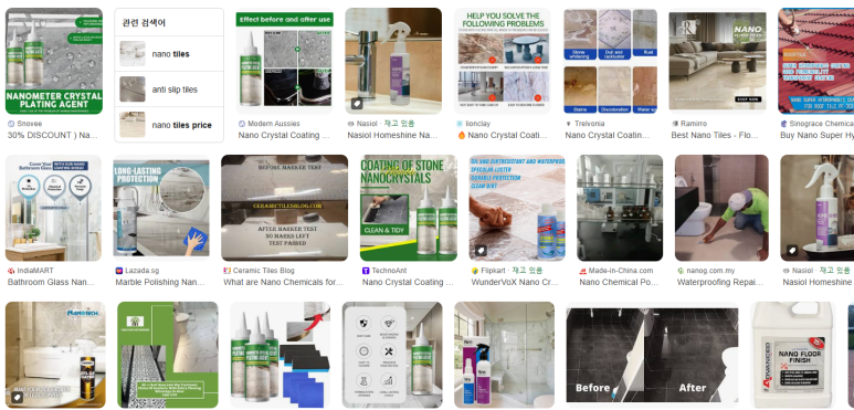 한국에서 주로 판매되는 나노코팅 제품은 중국산 또는 미국산 제품이 많습니다. 미국산의 경우에는 일부 고급 브랜드가 있으며, 이는 주로 세라믹이 아닌 금속, 유리, 자동차 등 다양한 소재에 적용되도록 개발된 제품입니다. 이들은 타일에 맞는 맞춤형 제품이 아니며, 원래의 용도와 다르게 한국에서는 타일 코팅용으로 홍보되는 경우가 많습니다.