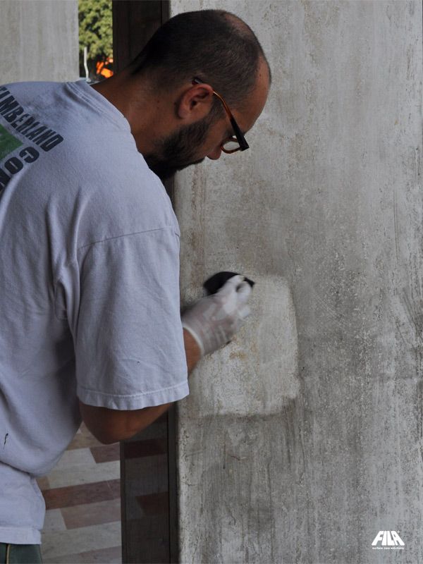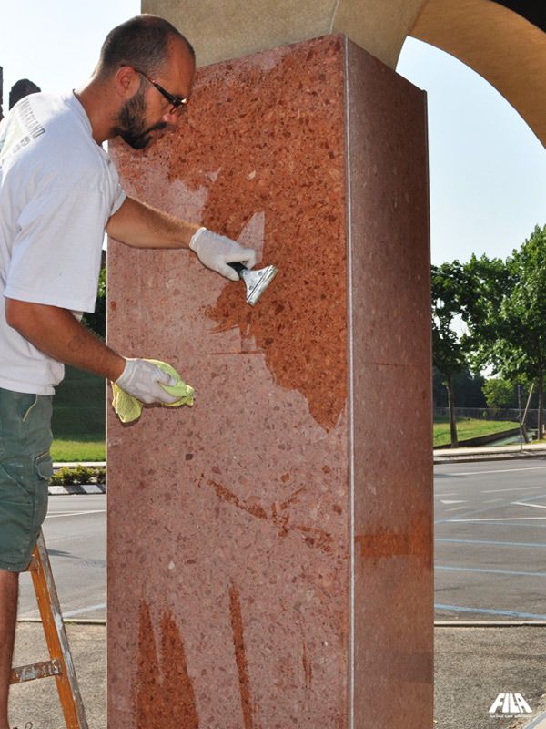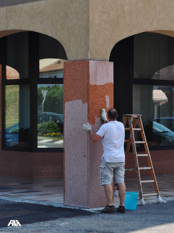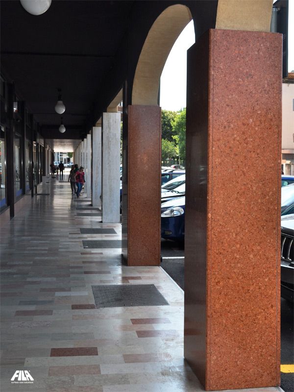 비와 악천후, 그러나 무엇보다도 베로나의 붉은 대리석 덩어리의 기둥에 매일 내리쬐는 뜨거운 태양은 표면을 건조시켜 재료를 표백하여 주랑 내부의 호텔 외관을 덮고 있는 것과 거의 다르게 보였습니다. 치장 벽토로 된 석회화 측면 기둥도 세월을 보여주고 있었습니다: 도로와 스모그의 검은 먼지가 재료 깊숙이 침투하여 자연스러운 광택을 흐리게 했습니다. 소재를 원래의 광택으로 복원하는 작업은 FILA와 자주 협력하는 젊고 의욕적인 전문가인 트리트먼트 전문가 Alberto Sgarbossa에게 의뢰되었습니다. 베로나의 붉은 대리석과 옅은 트래버틴은 PS87 PRO로 세척하여 수년에 걸쳐 쌓인 모든 먼지를 제거했습니다. 그런 다음 베로나 레드 대리석은 천연석, 대리석, 화강암 및 응집체를 위한 색상 향상 보호제인 STONEPLUS로 보호되었습니다. 한편, 창백한 석회화는 먼지와 낙서에 대한 이상적인 얼룩 보호제인 MP90으로 보호되었습니다.