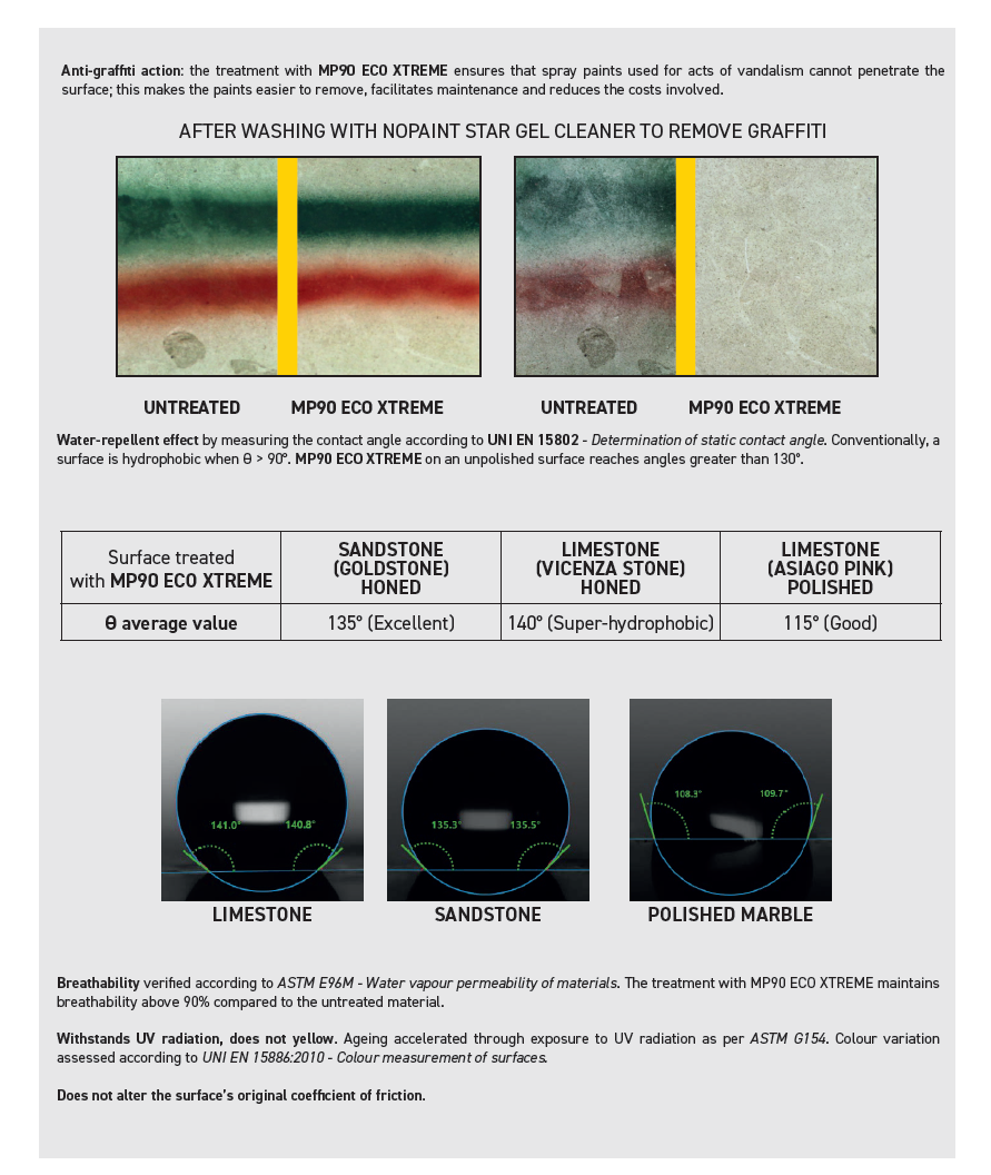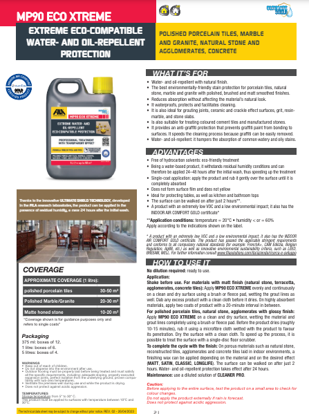 FILA의 MP90 ECO XTREME은 흙과 얼룩에 대한 친환경 방어력을 제공하는 보호제로, 재료 표면을 침투시켜 흡수를 줄이면서도 마감의 미관을 유지합니다. 유기 수지를 물에 현탁시킨 형태로 구성된 이 보호제는 밀도 1.004 kg/l, pH 9.9, 발화점 > 93°C의 특성을 가지고 있습니다. 탄화수소 용제가 없으며, 수평 및 수직 표면 모두에 적합하여 실내외에서 사용 가능합니다. 특히 주방 및 욕실 상판을 보호하는 데 이상적입니다.