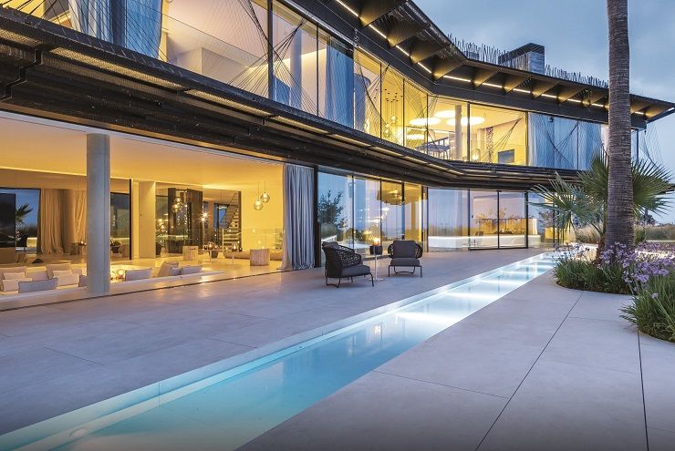 빌라 솔리테어는 건축가 마테오 툰 (Matteo Thun)이 설계했으며 4 층에 걸쳐 개발 된 2,380 평방 미터를 차지합니다. 7개의 침실, 6개의 마스터 욕실, 수영장 및 스파, 라운지, 야외 영화관 및 2,000제곱미터가 넘는 테라스가 있습니다. 이 모든 요소에는 공통된 특징이 있습니다 : 팔로마 스톤은 세비야의 La Pedrera 채석장에서 추출 된 순수한 흰색의 매우 저항력이 강한 석회암입니다.